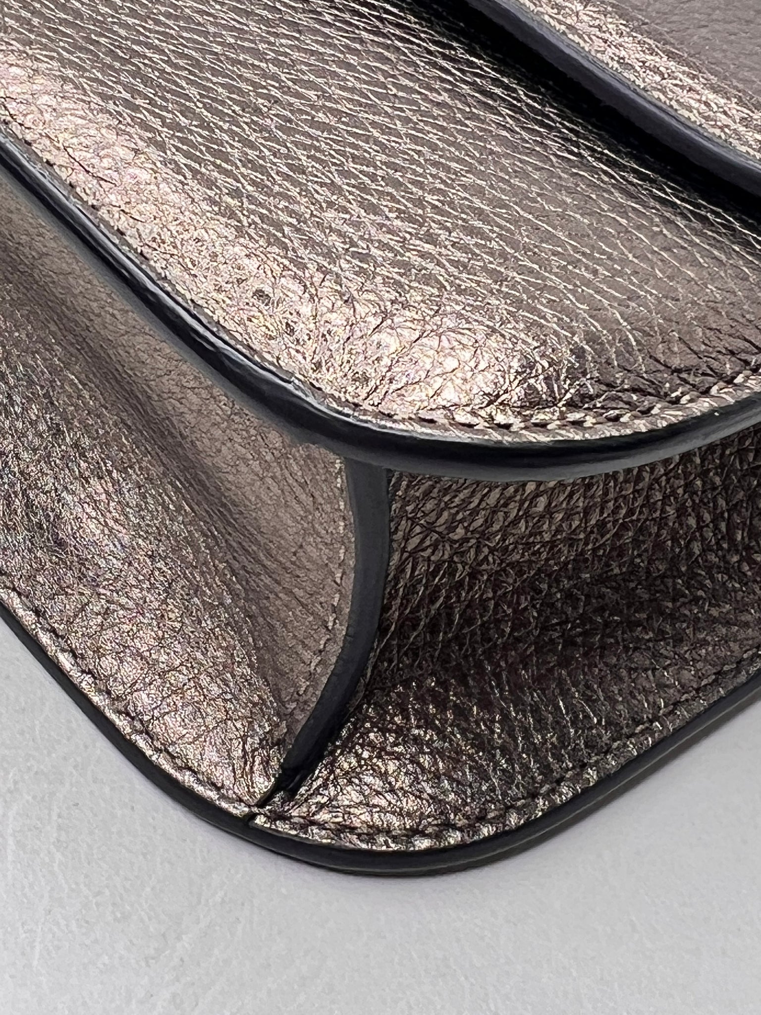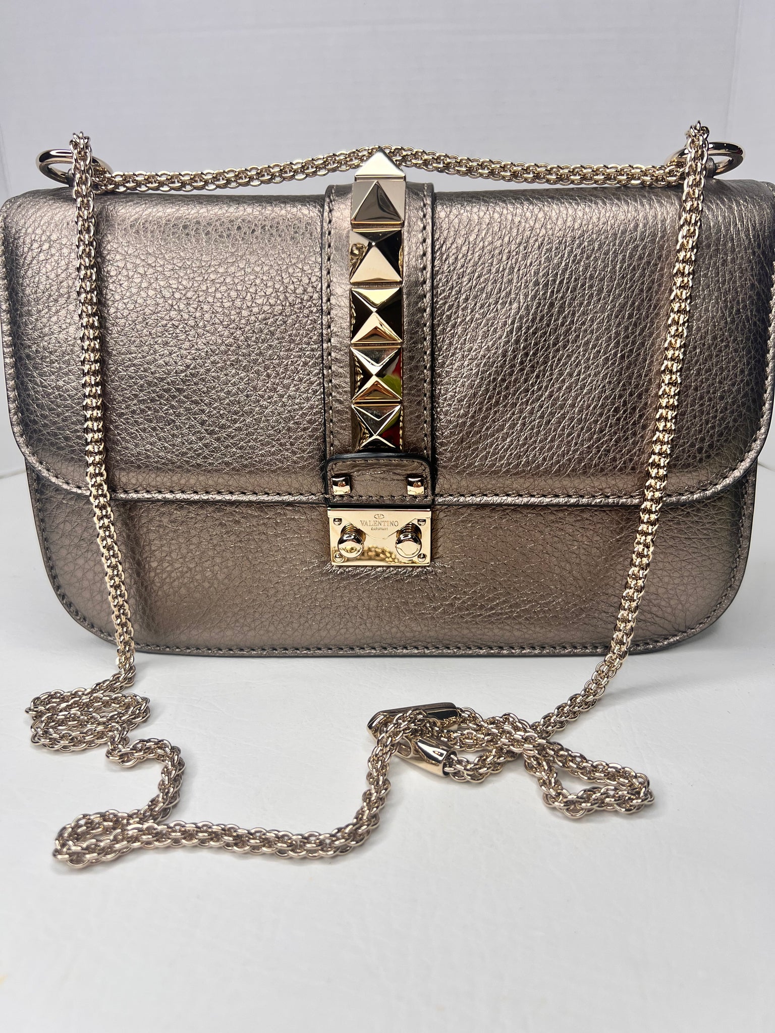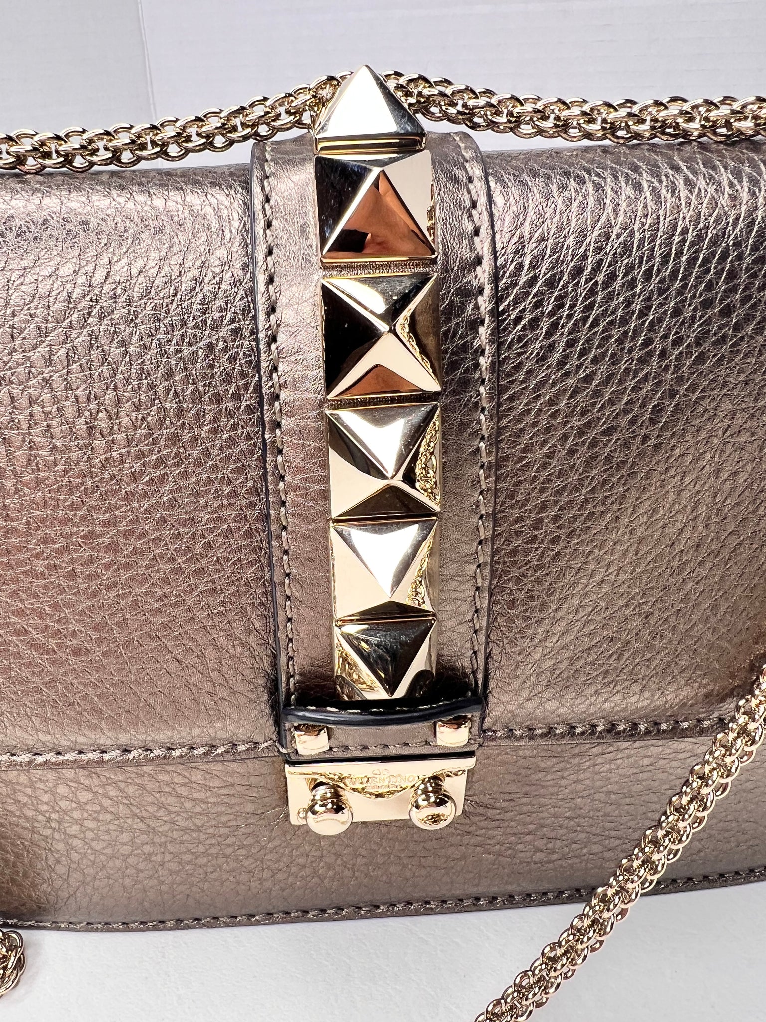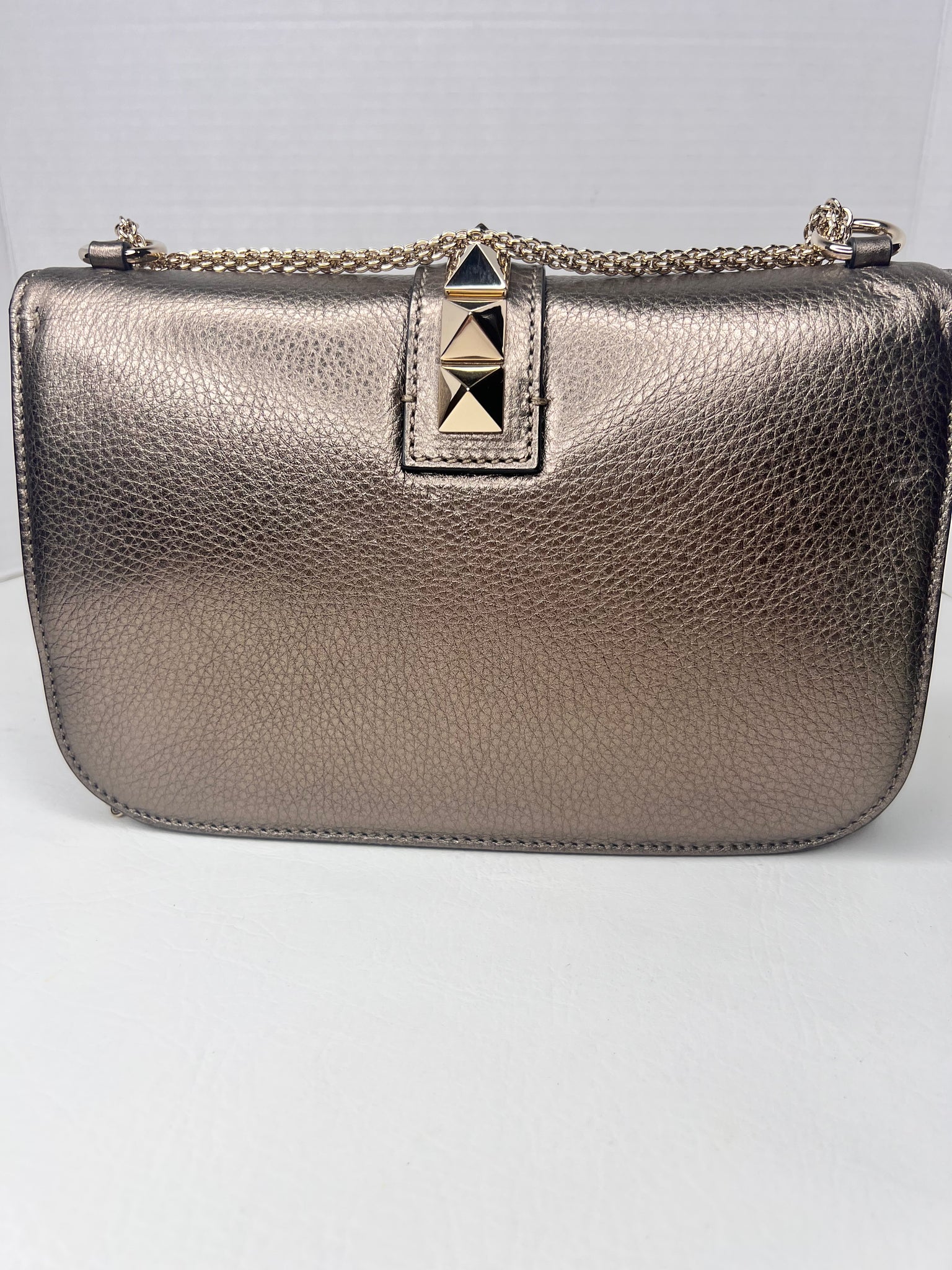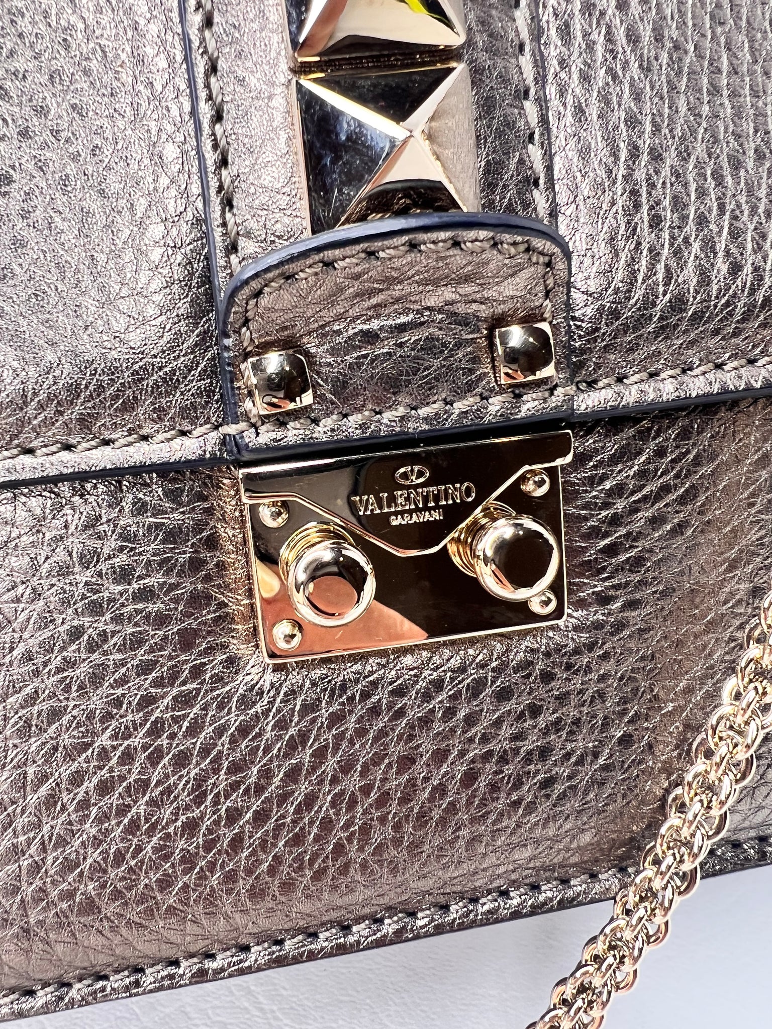 This stylish metallic shoulder bag features a chic design with a chain strap and studded rockstud accents. Perfect for adding a touch of glamour to any outfit.
